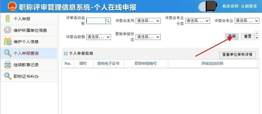 第三步:进入职称评审管理信息系统,点击左侧个人申报查询。