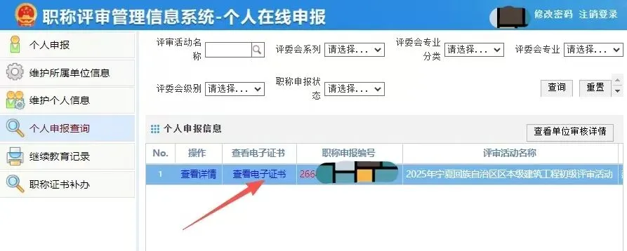 宁夏人力资源和社会保障厅官网→专业技术人员服务平台→职称申报与继续教育查询