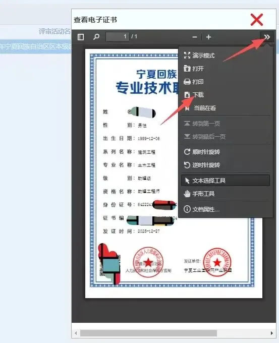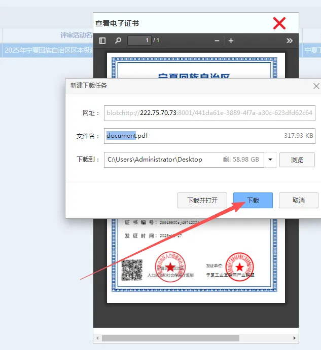 第五步:点击查看电子证书,即可下载使用(如图箭头所示)。