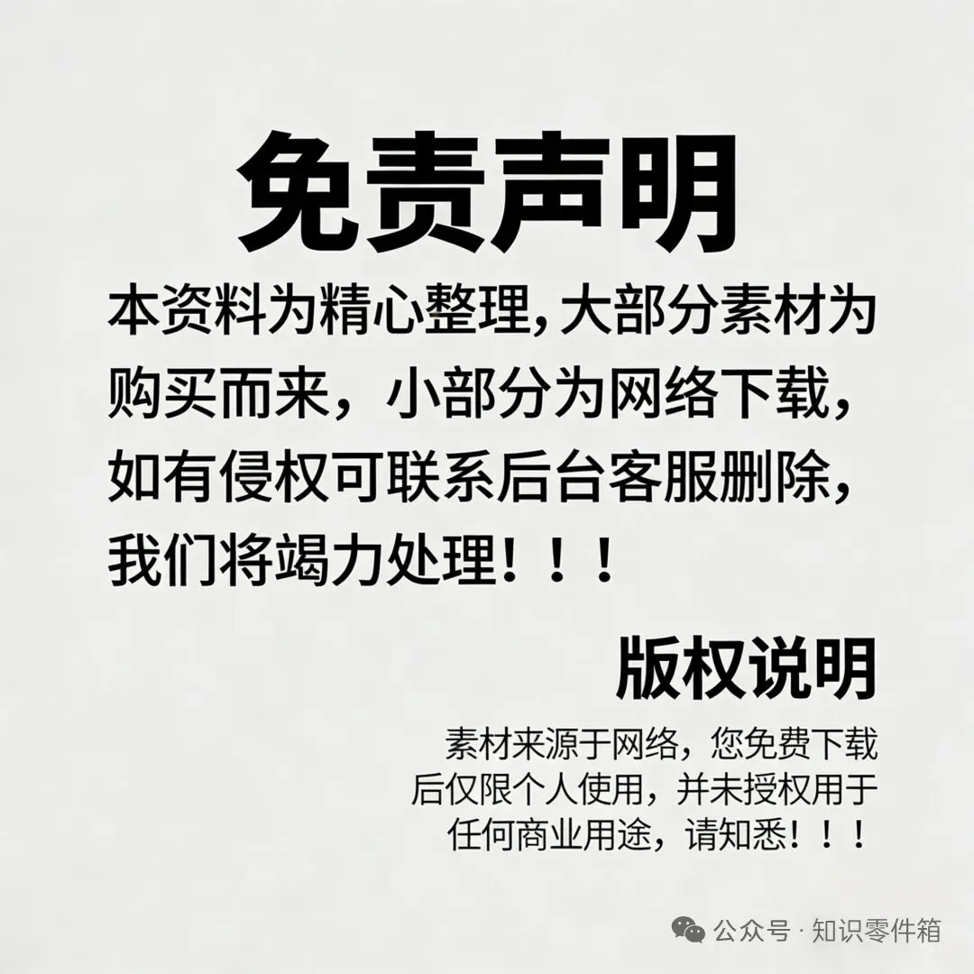 后期,我们还会不断更新更多优质免费资料,比如职场技能提升教程,助您在职场升职加薪;兴趣爱好培养课程,让您能尽情探索自己的兴趣领域。只要您持续关注“知识零件箱”公众号,这些宝贵资源就能第一时间免费领取啦!