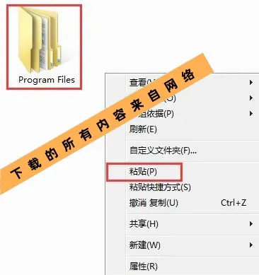 3.可将“Program Files”文件夹粘贴至除C盘外的其他磁盘,例如在D盘空白区域单击鼠标右键,从弹出的菜单中选择“粘贴”即可完成操作。
