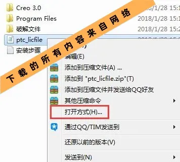 4.在解压得到的文件夹中,找到名为“ptc_licfile”的文件,使用鼠标右键点击该文件,在弹出的菜单中选择“打开方式”即可。