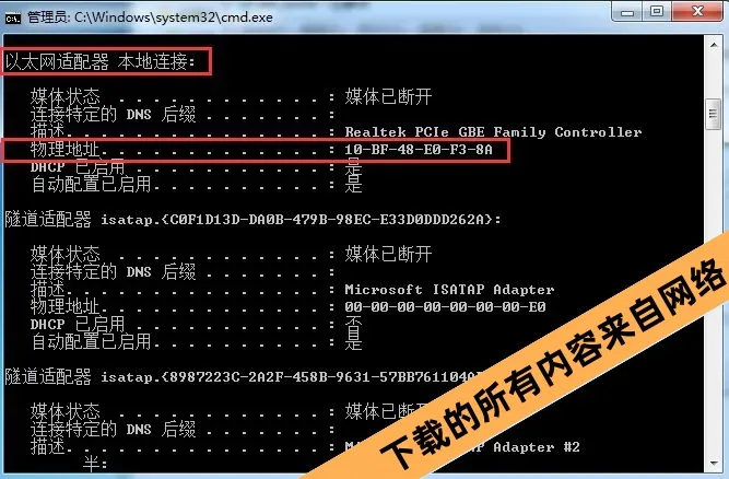 8.找到“以太网适配器 本地连接:”下的物理地址。
