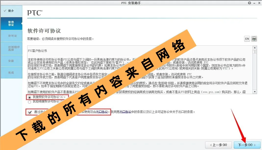 21.勾选“我接受软件许可协议”复选框以及“通过选中此框,我确认该软件的安装和使用符合出口协议”复选框后,点击下一步即可。
