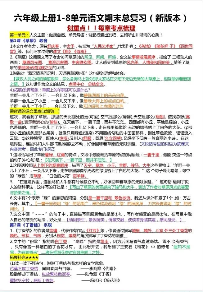 今天给大家整理了六年级上册1-8单元语文期末总复习(新版本),转发给朋友或班级群,受益更多人,帮助孩子学习!