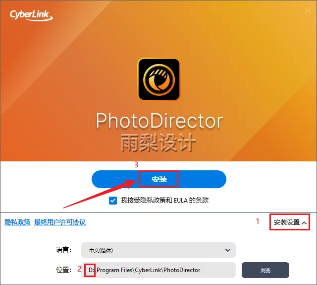 3.点击【安装设置】,把安装路径前面的C改成D,点击【安装】