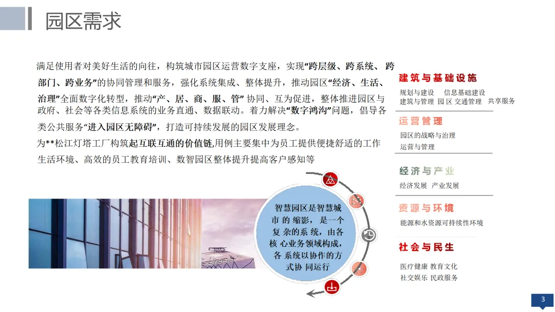 在安全管理方面,方案提出了构建统一的智慧园区安全管理平台,集成视频监控、门禁系统、消防信息管理等多种功能,通过实时预警和数据分析,提升园区安全监管效率。同时,方案还关注园区的绿色节能和生态环保,通过智能能源管理和环境监测系统,实现园区能源的高效利用和环境质量的持续改善。