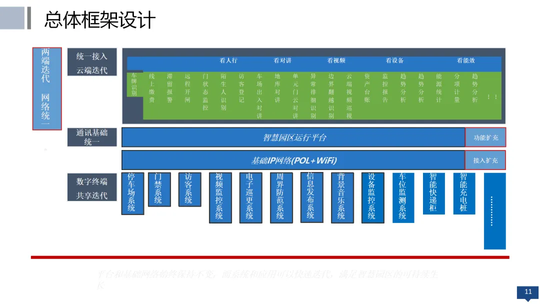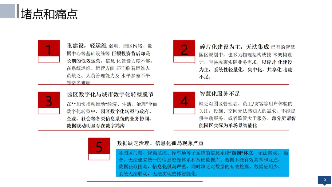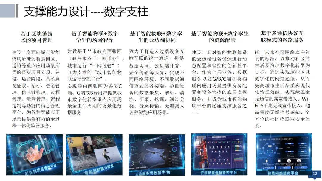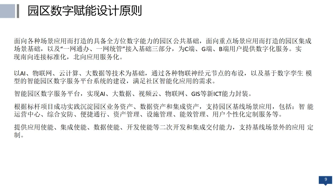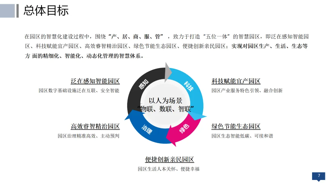 在顶层规划部分,方案设定了打造“五位一体”智慧园区的总体目标,包括泛在感知智能园区、科技赋能宜产园区、高效睿智精治园区、绿色节能生态园区及便捷创新亲民园区。为实现这一目标,方案详细规划了数字赋能的设计原则,提出了基于智能物联、数字孪生、区块链等新技术的数字底座和云边端协同架构,确保园区数字基础设施的泛在互联和安全智能。