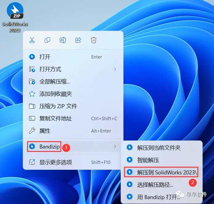 1、下载SolidWorks 2023软件安装包到电脑上,右键选择【解压到SolidWorks 2023\】