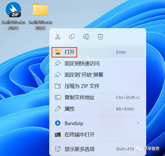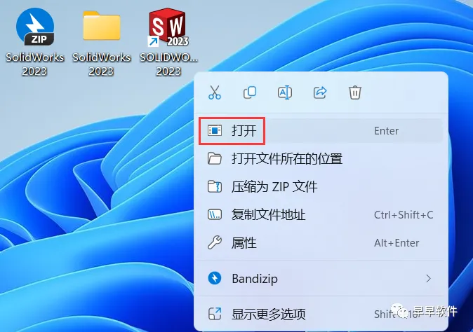 32、回到桌面,右键桌面上的【SolidWorks 2023软件图标】,点击【打开】