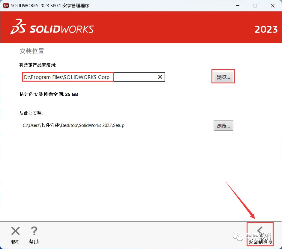 23、软件默认安装在C盘,可自定义更改软件安装位置,这里小编选择安装在D盘;点击【返回到摘要】