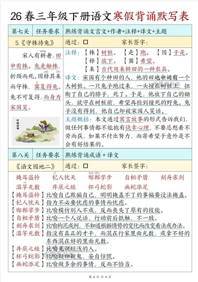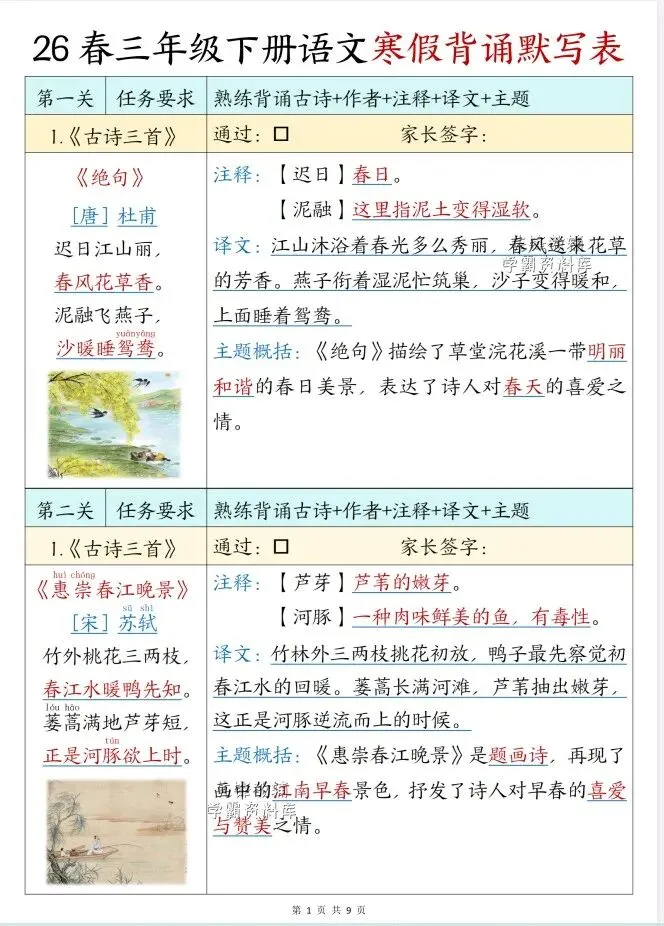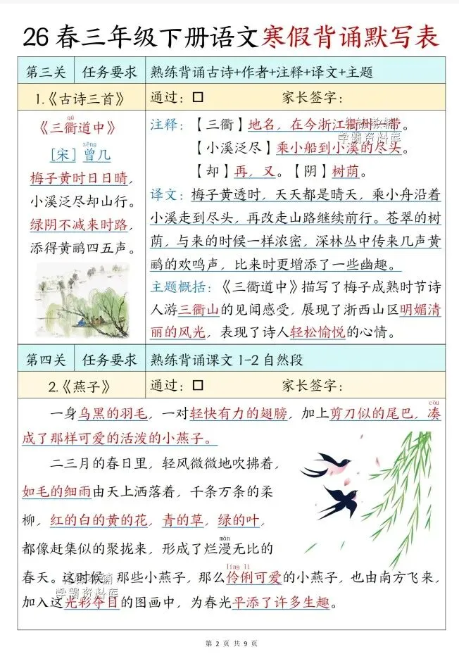 今天给大家整理了26春版三年级下册语文寒假背诵表,转发给朋友或班级群,受益更多人,帮助孩子学习!
