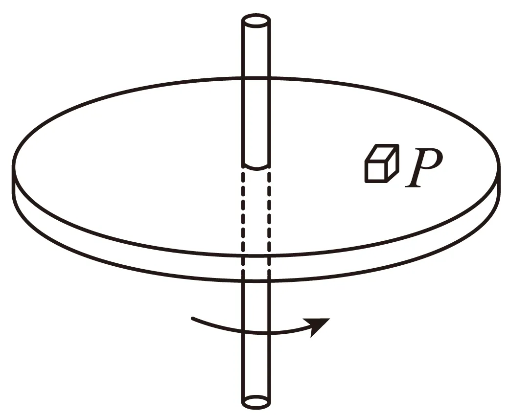 10. 如图所示,圆盘在水平面内以角速度ω绕中心轴匀速转动,圆盘上距轴r处的P点有一质量为m的小物体随圆盘一起转动。某时刻圆盘突然停止转动,小物体由P点滑至圆盘上的某点停止。下列说法正确的是( )