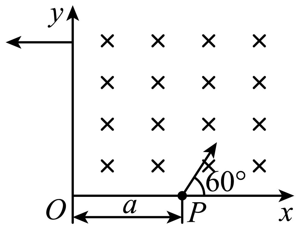 12. 如图所示,在xOy坐标系的第一象限内存在匀强磁场。一带电粒子在P点以与x轴正方向成60°的方向垂直磁场射入,并恰好垂直于y轴射出磁场。已知带电粒子质量为m、电荷量为q,OP = a。不计重力。根据上述信息可以得出( )