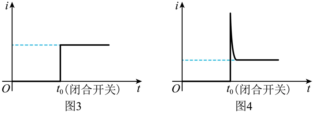 (4)用电流传感器测量通过定值电阻的电流,电流随时间变化的图线如图3所示。将定值电阻替换为小灯泡,电流随时间变化的图线如图4所示,请分析说明小灯泡的电流为什么随时间呈现这样的变化。()