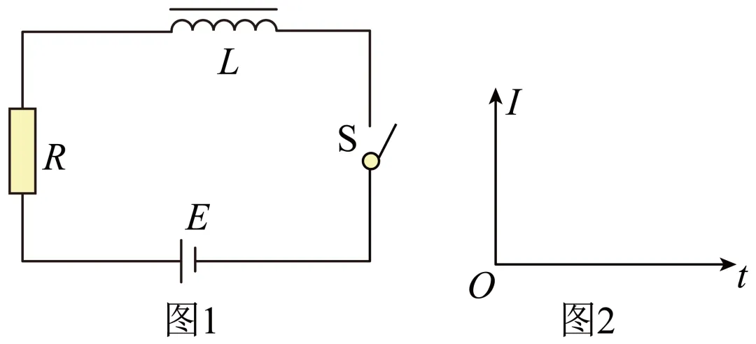 (2)情境2:如图1所示,电源电动势为E,线圈自感系数为L,电路中总电阻为R。闭合开关S,发现电路中电流I随时间t的变化规律与情境1中物体速率v随时间t的变化规律类似。类比①式,写出电流I随时间t变化的方程;并在图2中定性画出I - t图线。