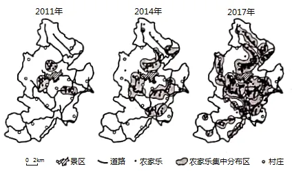我国东部某山区有一AAAA级景区,2011~2017年游客数量持续增加,景区周边农家乐数量逐年增多,分布范围不断扩大,下图示意2011、2014年和2017年景区周边农家乐的空间分布。据此完成下面小题。