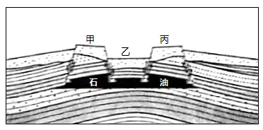 根据材料“在多次区域性水平挤压力作用下,大型燃料油藏受到构造甲、乙、丙的破坏,使石油组分大量散失”可知,形成构造甲、乙、丙的局部地质作用应为地壳水平运动而非垂直运动,CD错;图中岩层弯曲,应是受到水平挤压的影响,压力超过了岩层的承受能力导致岩层断裂并发生位移,乙处岩层断裂下陷,甲、丙处岩层断裂抬升,A正确,B错。故选A。