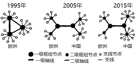 加强中国与欧洲的经贸联系是“一带一路”建设的重要组成部分,海运是中欧贸易的主要运输方式,根据1995年、2005年和2015年中欧港口的节点度(以港口吞吐量和航线数量等指标衡量)及联系强度(反映港口间货物流量),确定各年份分级标准,绘制中欧航运网络核心组织结构图(下图)。在中欧海运贸易量总体增长的背景下,中国港口的相对地位明显提高,枢纽节点从无到有,形成了以南方港口为枢纽的网络组织结构。据此完成下面小题。