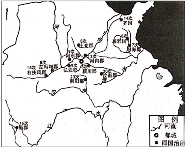 2. 东汉前期,许慎在编撰《说文解字》时,征引全国各地的政区地名资料,用以分析字形、考辨字义。其中提及次数较多的郡、国如图所示。这反映了该时期( )