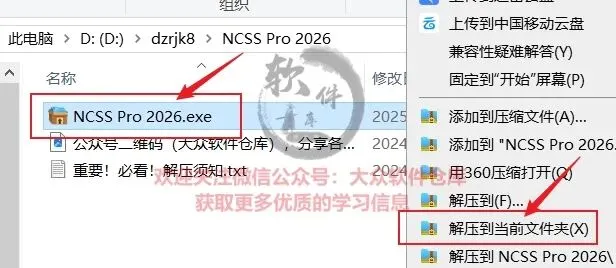 1.把资源从网盘下载到电脑上面并右键NCSS Pro 2026.exe压缩包选择解压到当前文件夹;