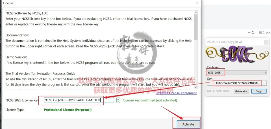 16.产品中选择NCSS 2025,然后点击Generate生成激活码,将生成的激活码复制粘贴至激活界面,然后点击Activate;