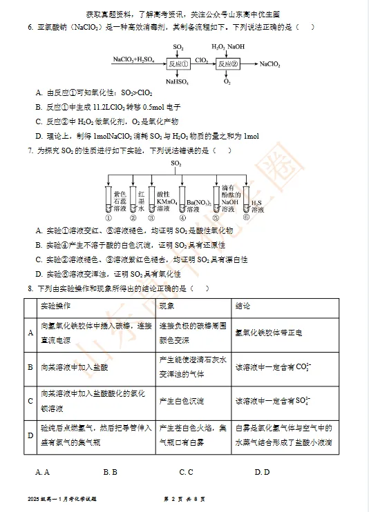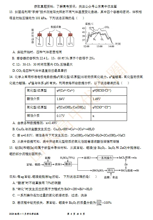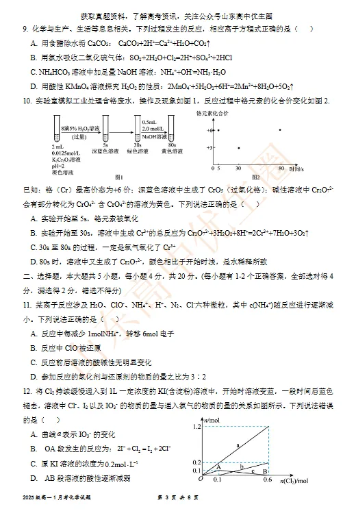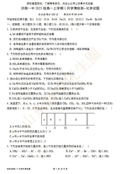【免费下载】济南一中2025级高一上学期化学期末检测题,可打印