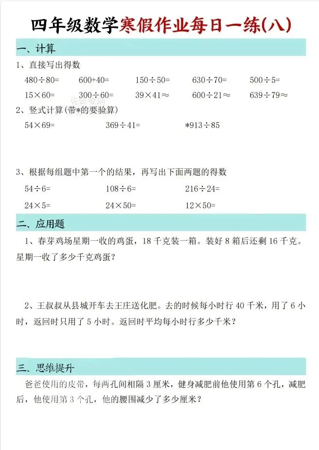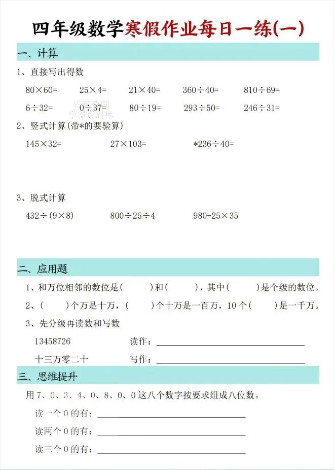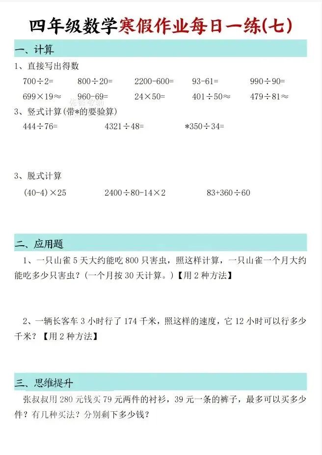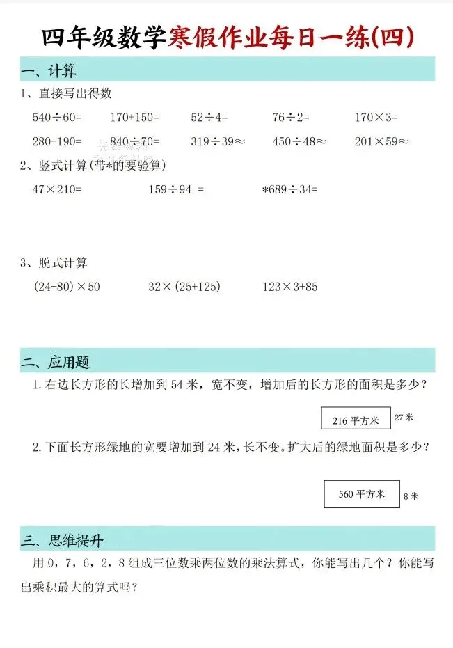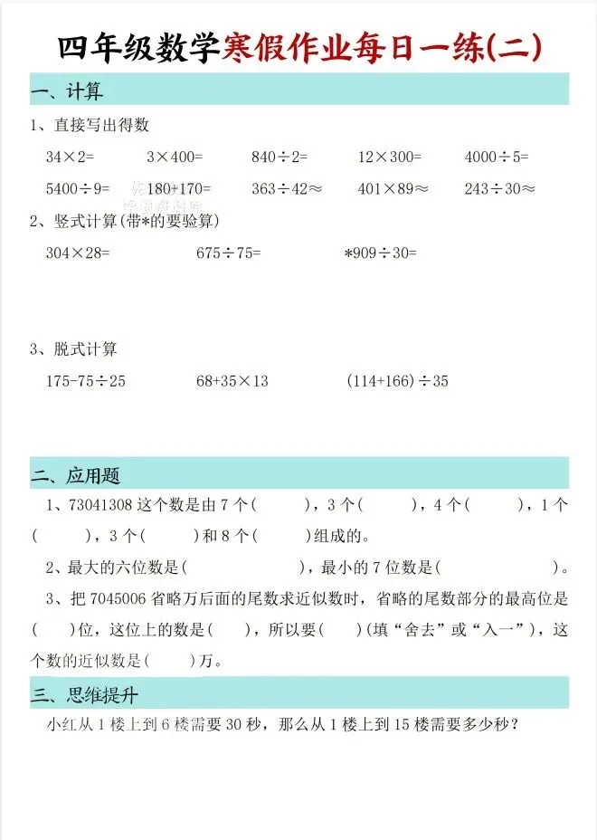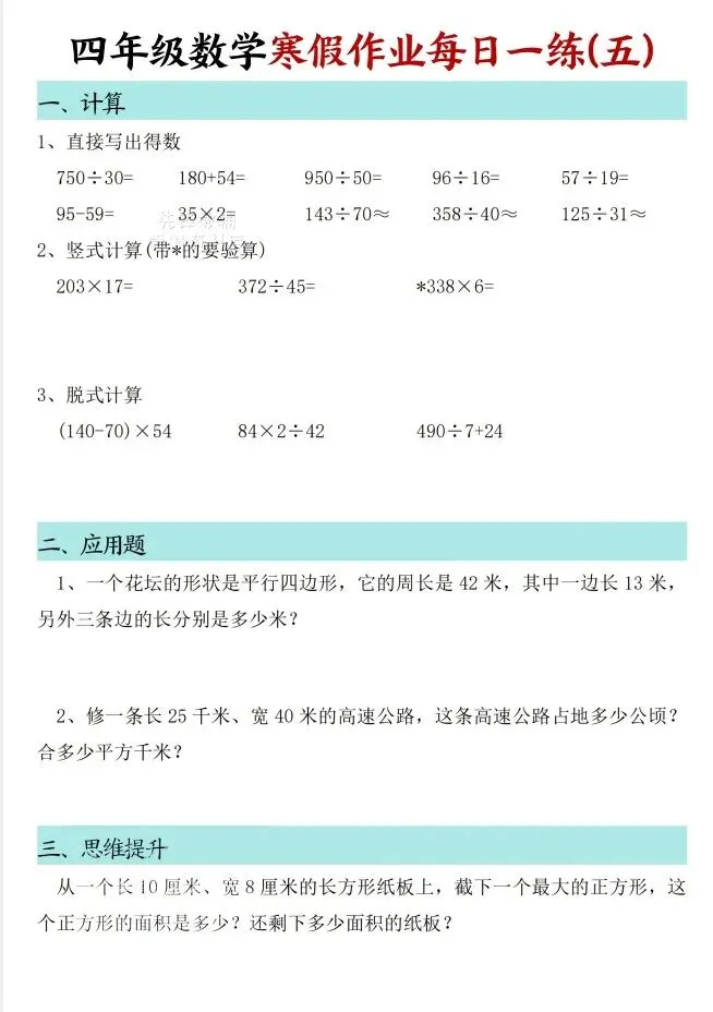 今天给大家整理了四年级数学寒假作业每日一练,转发给朋友或班级群,受益更多人,帮助孩子学习!