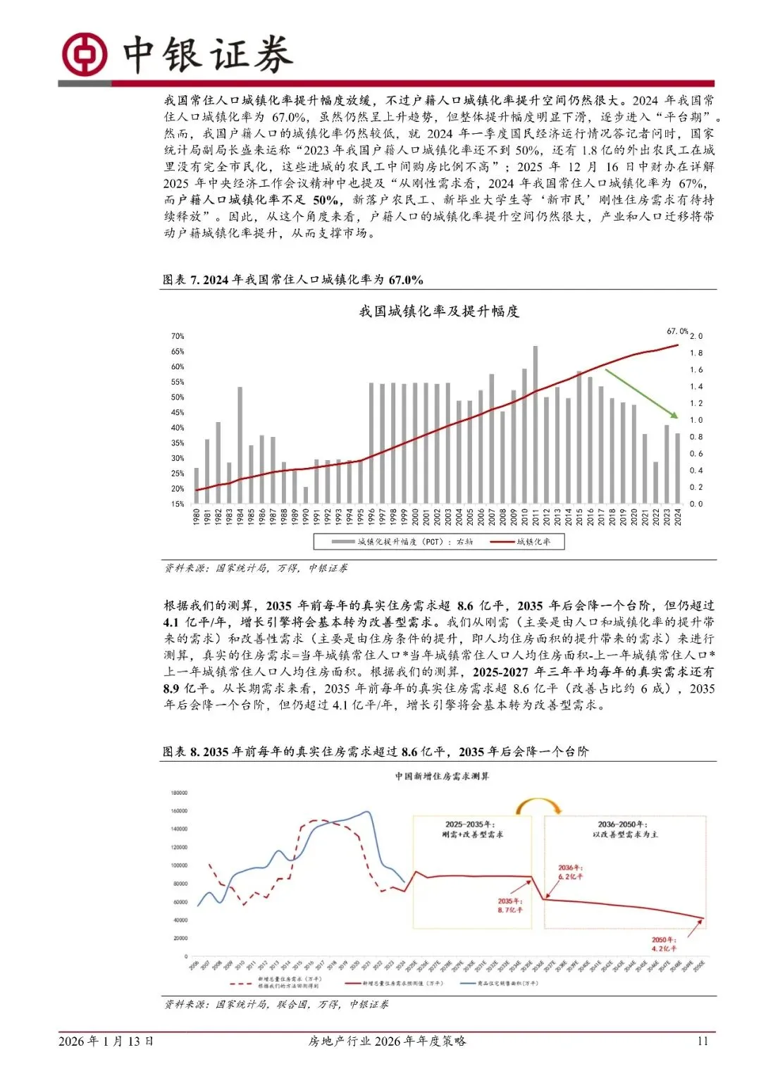 2)过去通过人口和城镇化率提升带来的房地产市场规模扩张的红利不复存在,未来需求从“有房住”转变为“住好房”,结构性需求仍在,但短期较难弥补总量收缩。我国总人口 21 年达到峰值后逐年下降。22 年以来35-44 岁人口(潜在改善型购房需求人群)占比上升,潜在刚需人群(25-34 岁)占比下降。24 年我国常住人口城镇化率 67%,提升幅度下滑,逐步进入“平台期”。不过目前户籍人口城镇化率不足 50%,产业和人口迁移将带动户籍城镇化率提升,从而支撑市场。根据我们的测算,2035 年前每年的真实住房需求超 8.6 亿平,2035 年后会降一个台阶,但仍超过 4.1 亿平/年,增长引擎将会基本转为改善型需求。