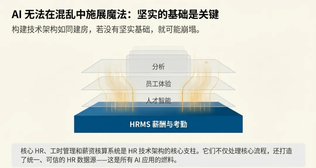 企业要想充分发挥AI在人力资源领域的潜力,必须先夯实核心HR、工时管理和薪资核算这三大基础系统。
