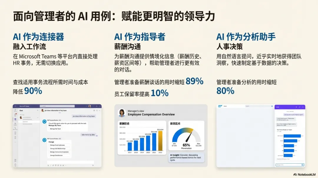 高绩效企业不仅用这些系统实现流程自动化,更将其作为推动业务转型的基石。报告指出,只有基于高质量、结构化且互联互通的数据,AI才能有效赋能员工(如智能问答与文书辅助)、管理者(如薪酬沟通与决策分析)和HR团队(如合规监控与政策解答),从而提升效率、优化体验并驱动更明智的战略决策。