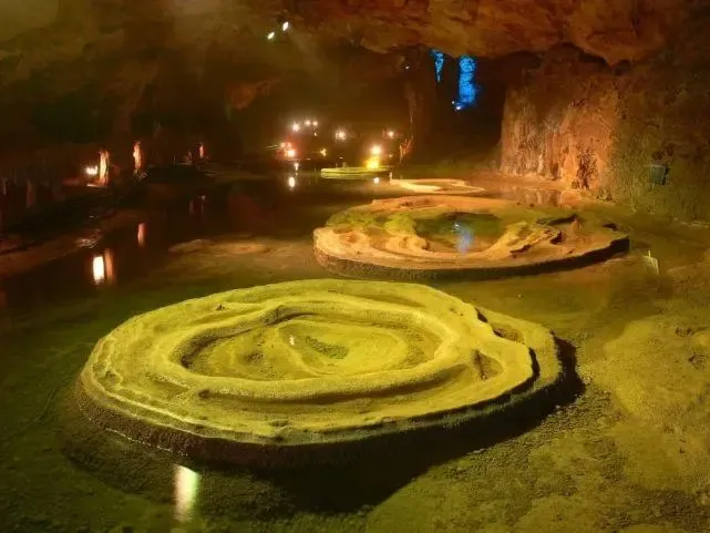 莲花盆是一种独特的地下喀斯特景观。它是在溶洞的薄层水中由水底向上发育的盆状或圆盘状沉积体(下图)。广西某溶洞数百米长的洞穴中,分布着百余座大小不一的莲花盆,最大的莲花盆直径达9米,据此完成下面小题。