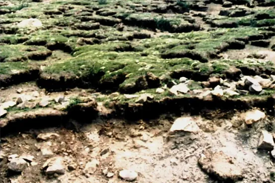 青藏高原常见的草毡层(下图),由交织缠结的植物活、死根系与细颗粒物混杂而成。草毡层的厚度约20~30厘米,随地表起伏无明显变化。草毡层中的细颗粒物与下伏物质(粗碎屑或基岩)的矿物、化学成分显著不同。草毡层对青藏高原生态安全具有重要意义.据此完成下面小题。