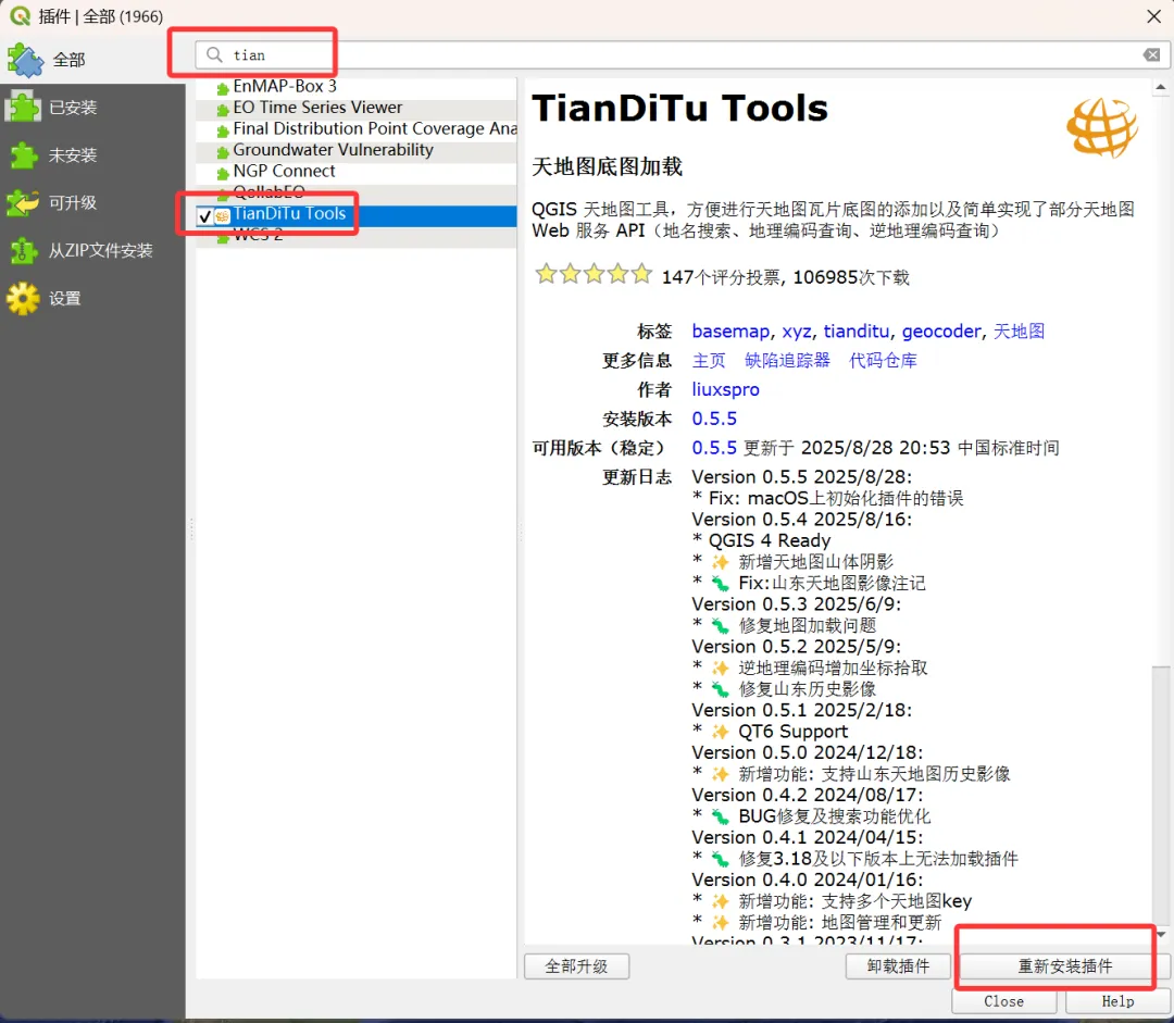1、打开QGIS,选择插件——管理并安装插件,在全部中搜索tian,找到TianDiTu Tools插件后点选,选择安装插件(我已经安装了所以变成了重新安装插件)
