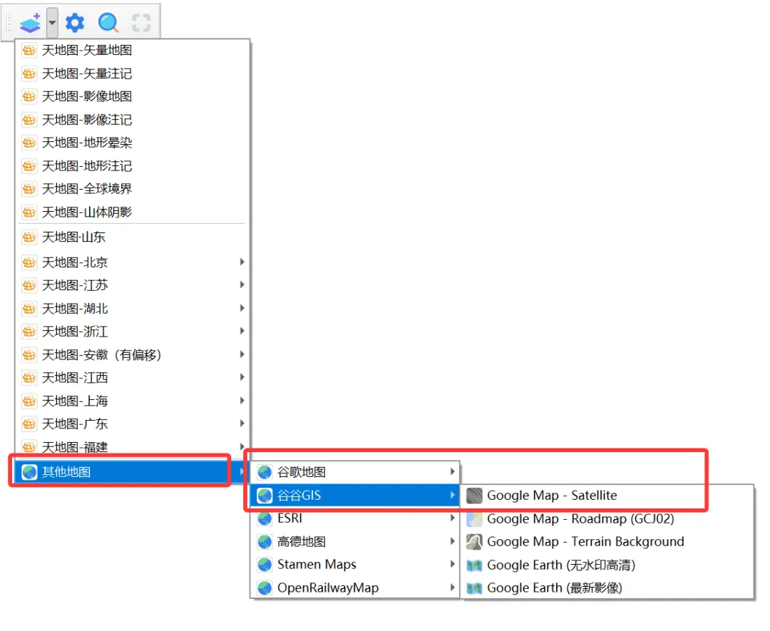 天地图插件工具条主要是国家太你的图的在线图源以及各省的天地图各省天地图包含历史影像(但是目前除了山东的没有其他省加载能用的)。在这个插件中有个其他图源,连包括了谷歌影像、ESRI的在线图源、高德图源以及其他图源。