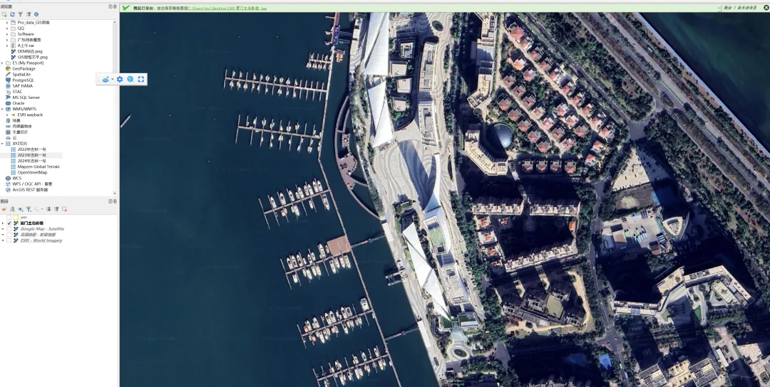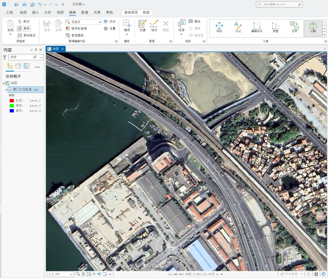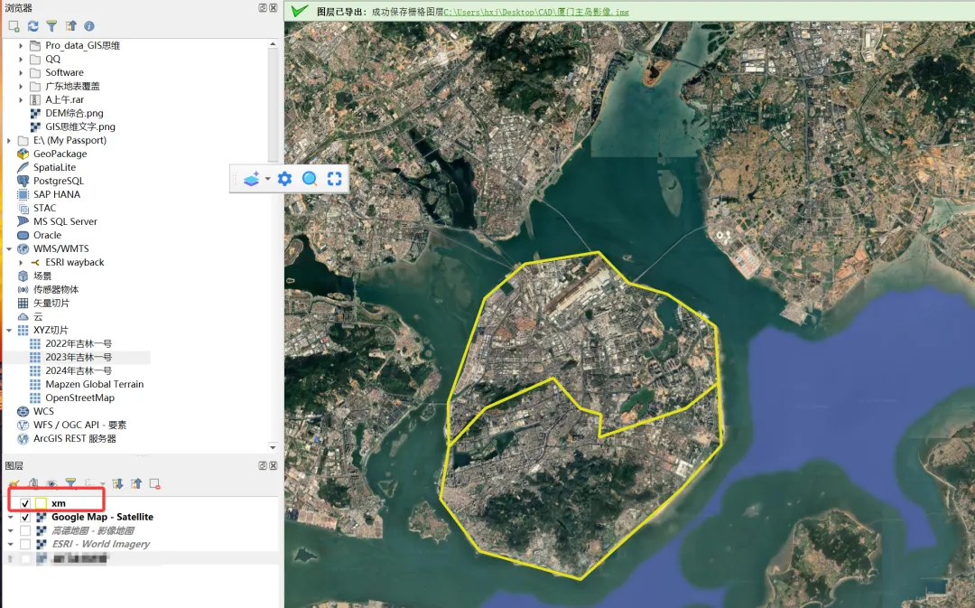 1、假设我需要下载福建省厦门岛内的谷歌影像性,我加载了岛内的矢量范围(xm.shp)如下图中黄色矢量线。