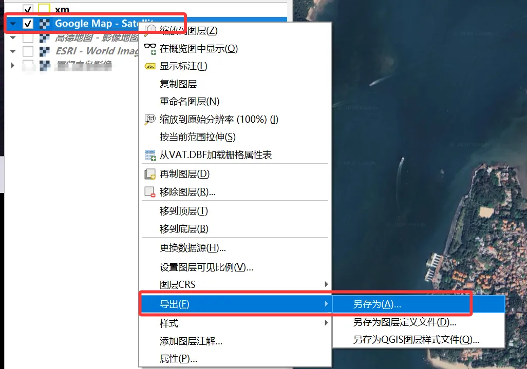 2、要下载影像只需要选择加载的谷歌影像图层,点击右键导出——另存为,