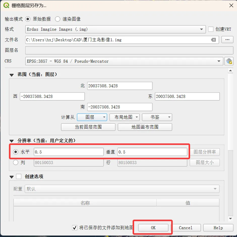 3、在跳出的栅格图层另存为中:1)设置输出格式(一般我建议为img格式);2)去掉创建VRT复选框;3)文件名设置输出路径;4)计算从图层下拉中选择矢量单位(xm.shp);5)设置需要导出的分辨率(我此次设置为0.5米,你可以根据需求设置)。