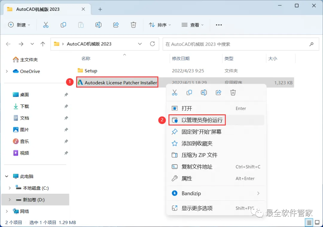 9、回到AutoCAD机械版 2023文件夹,找到【Autodesk License Patcher Installer】应用程序,右键选择【以管理员身份运行】它