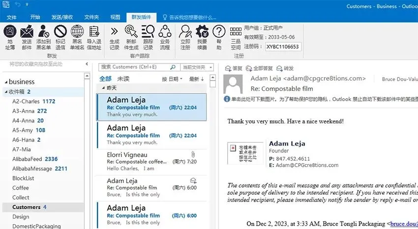 据我个人的使用经验而言,当我们的电脑上配备了小鹰系统,就相当于给了自己配置了一套高效率的武器,能够让我们更有效率地去做客户的长期邮件营销工作。小鹰系统,提供一个月免费试用,对于想利用Email营销开发更多客户的朋友,尽管试用,使劲用,用出效果。如下是Bruce的Outlook配置小鹰开发和跟客户邮件交流的界面,我喜欢小鹰。