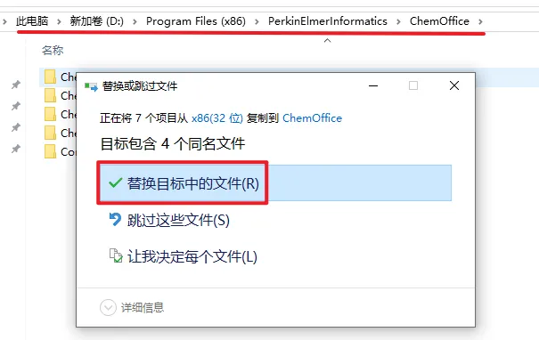 15、选中桌面上的32位的图标,右键选择打开文件所在位置 ![]() 16、点击”ChemOffice“ ![]() 17、粘贴复制的文件到ChemOffice路径下,选择”替换目标中的文件“ ![]() 18、安装结束 ![]() |