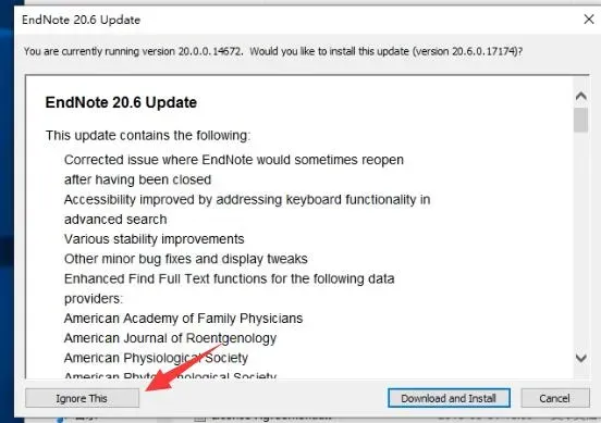 6、去刚才的安装位置,打开Endnote.exe。如果出现下面的弹窗,就点Ignore this选择忽略它,注意一定不要更新!