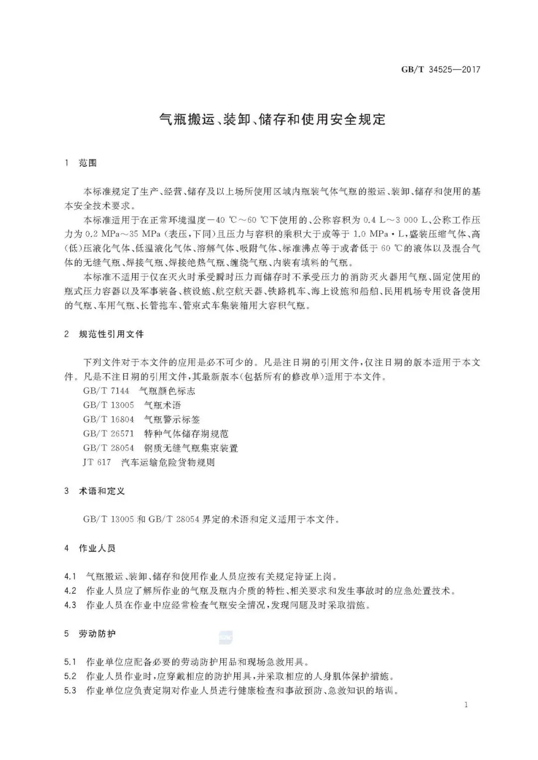 >免费下载!《气瓶搬运、装卸、储存和使用安全规定》(GBT+34525-2017)