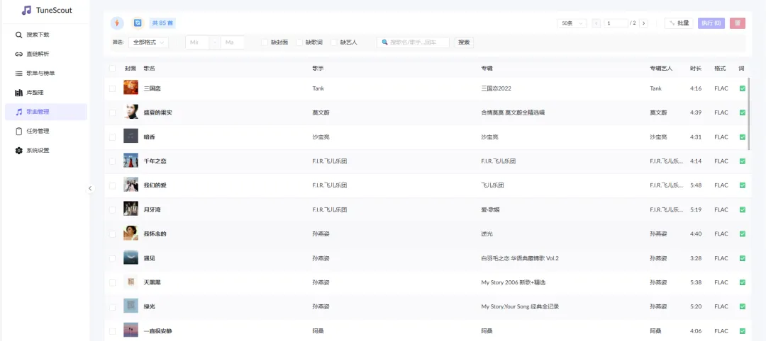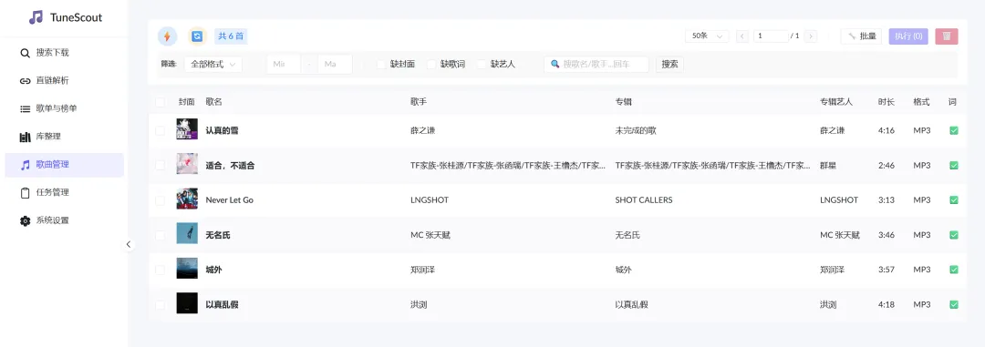 下载时自动补全标签是基础操作。它的厉害之处在于 批量刮削:你可以把一堆标签混乱的旧歌扔给它,它能联网补全封面、歌词。