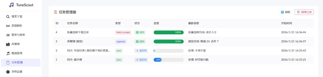 所有这些耗时操作都在后台异步进行。你可以在清爽的 Vue3 写的 Web 界面 里,看着一个个任务排着队,带着进度条依次完成。它通过 SQLite 管理任务队列,稳定可靠,随时可以查看每项任务的详细日志。