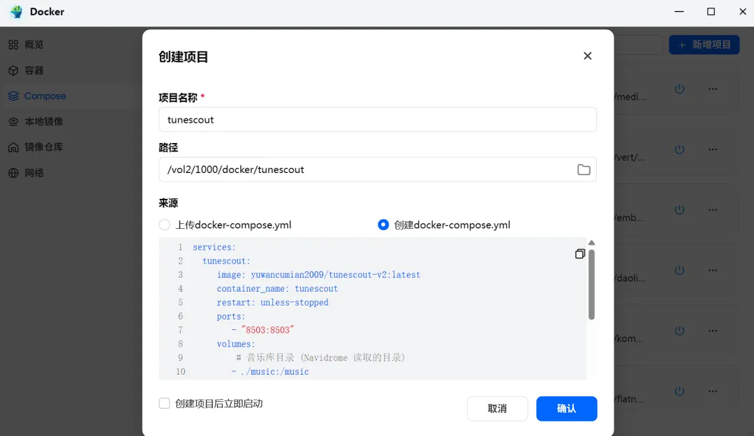 services: tunescout: image: yuwancumian2009/tunescout-v2:latest container_name: tunescout restart: unless-stopped ports: - "8503:8503" volumes: # 音乐库目录 (Navidrome 读取的目录) - ./music:/music # 下载暂存目录 - ./download:/download # 歌单文件输出目录 - ./playlists:/playlists # 配置文件与数据库,提前去目录创建!! - ./config.json:/app/config.json - ./library_cache.db:/app/library_cache.db - /var/run/docker.sock:/var/run/docker.sock environment: - TZ=Asia/Shanghai # 登录账户 - WEB_USERNAME=buzhengjingkeji # 登录密码 - WEB_PASSWORD=woshuaibushuai