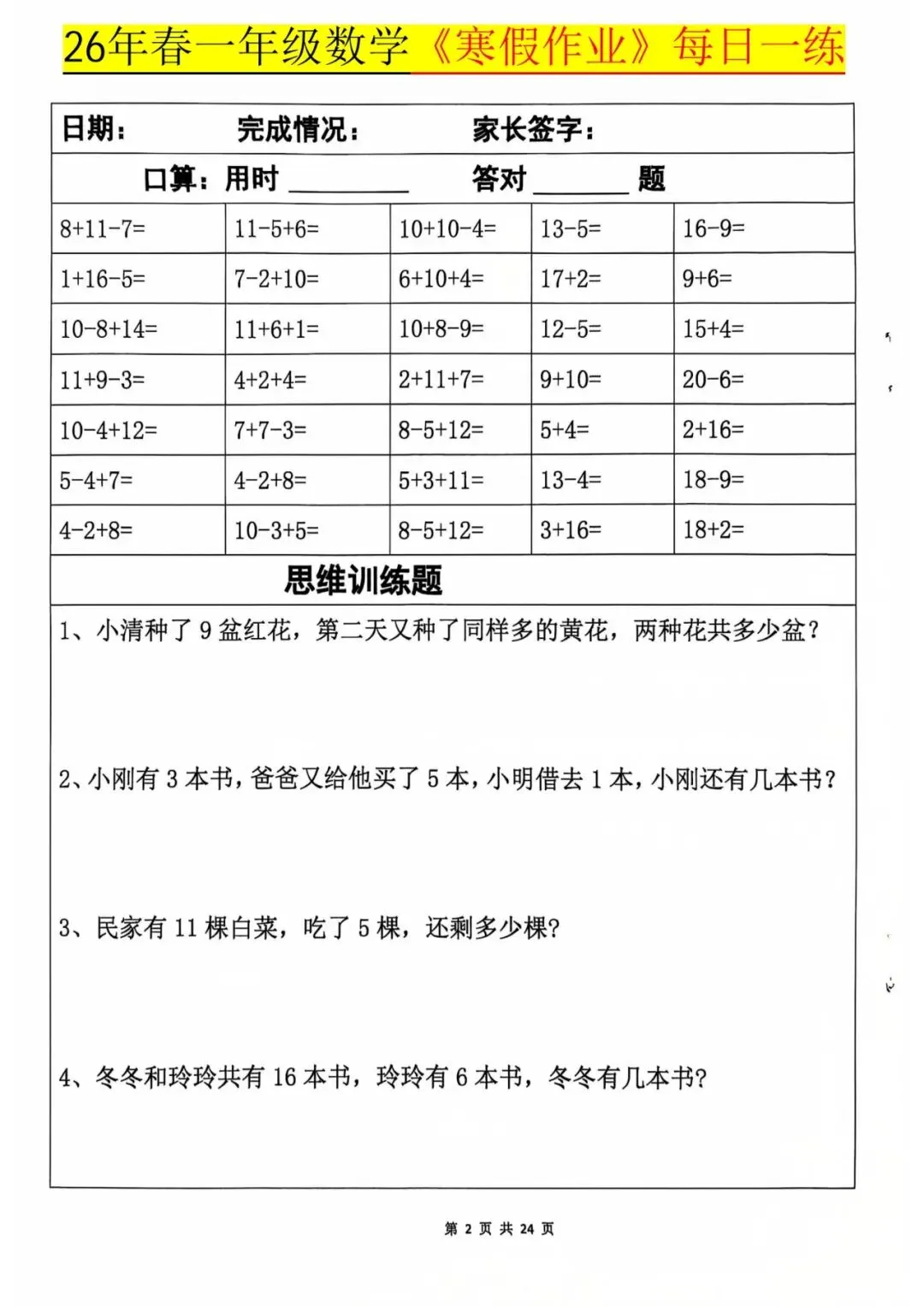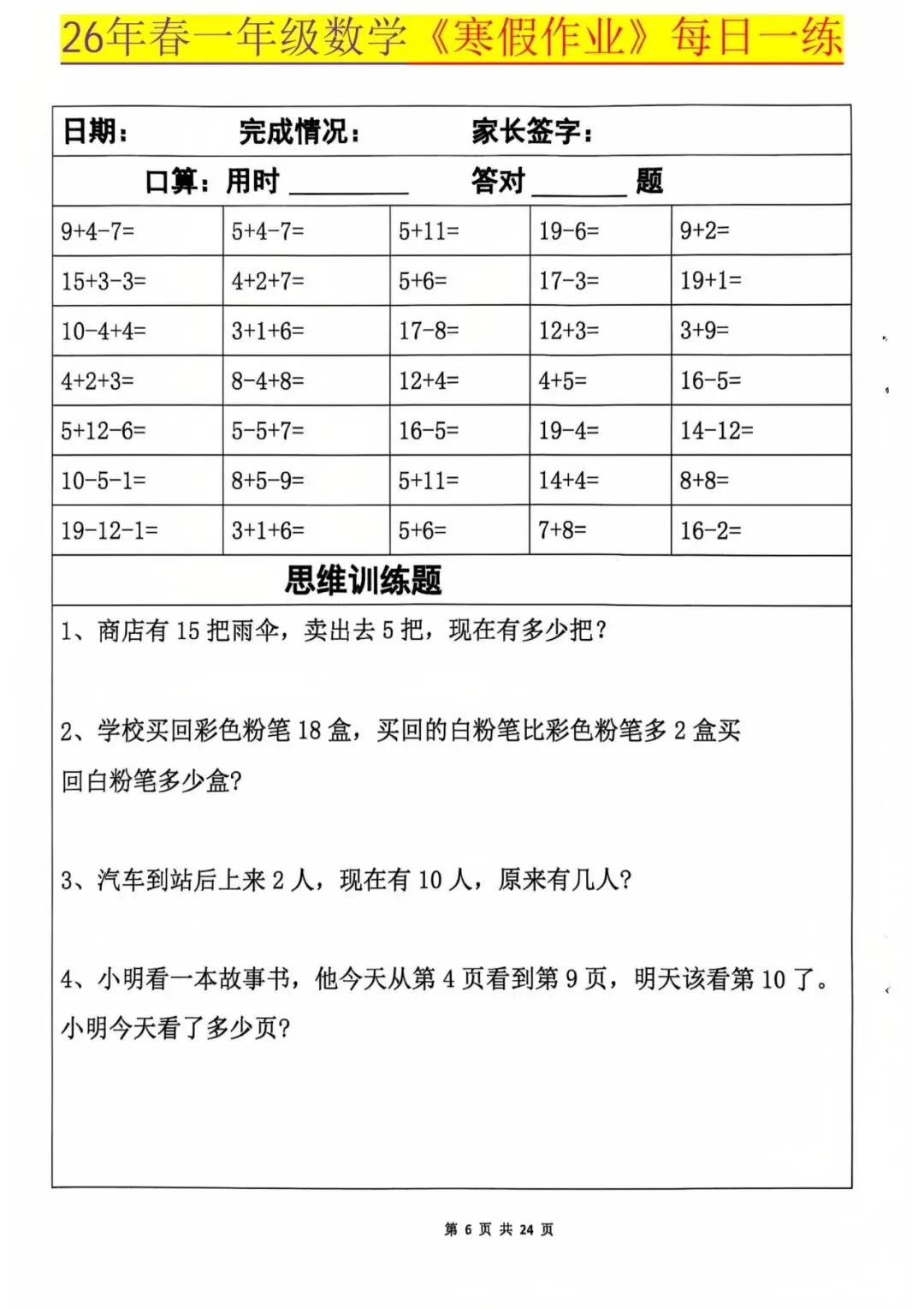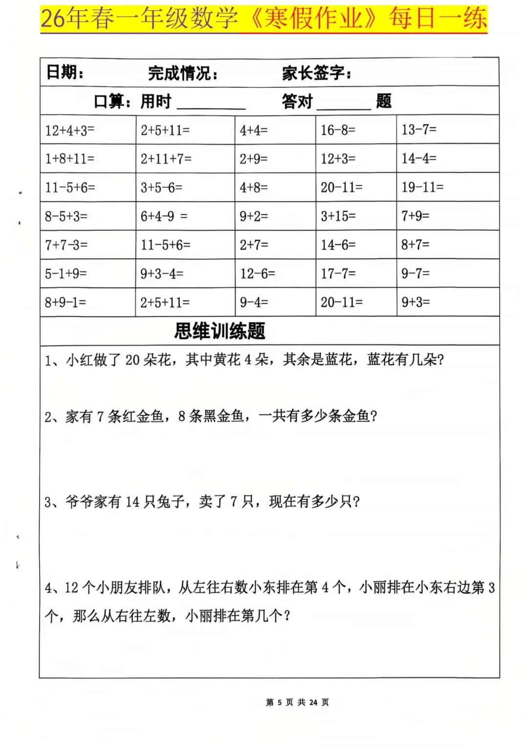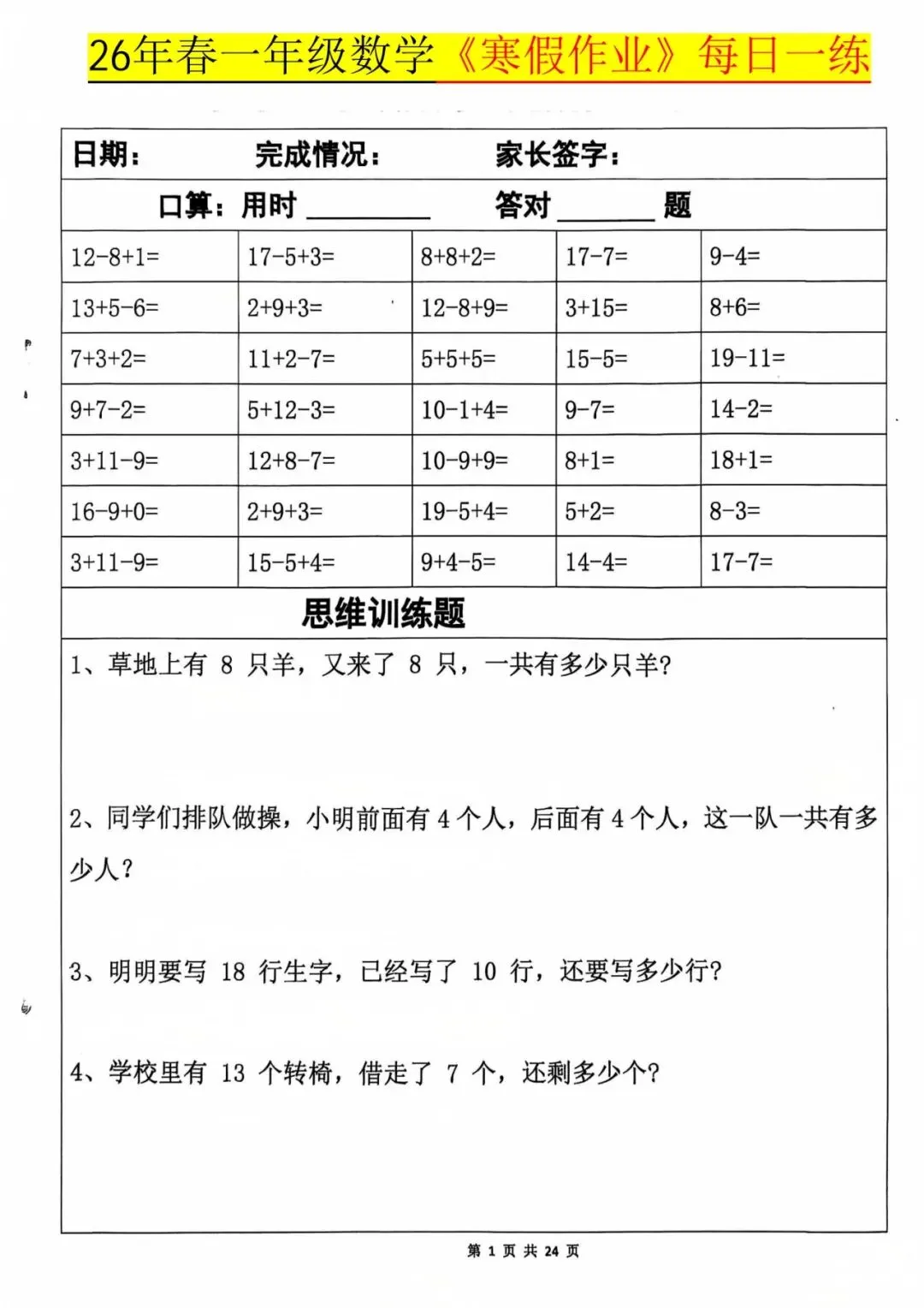 26春一年级数学寒假作业每日一练,家长可免费下载打印出来,帮助孩子学习,完整版高清可打印,下载方式见文末。