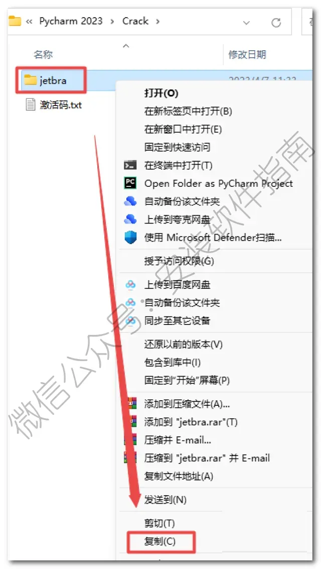 9、返回之前解压的“PyCharm 2023文件夹,双击打开“Crack”文件夹,鼠标右键点击“jetbra”文件夹选择“复制”