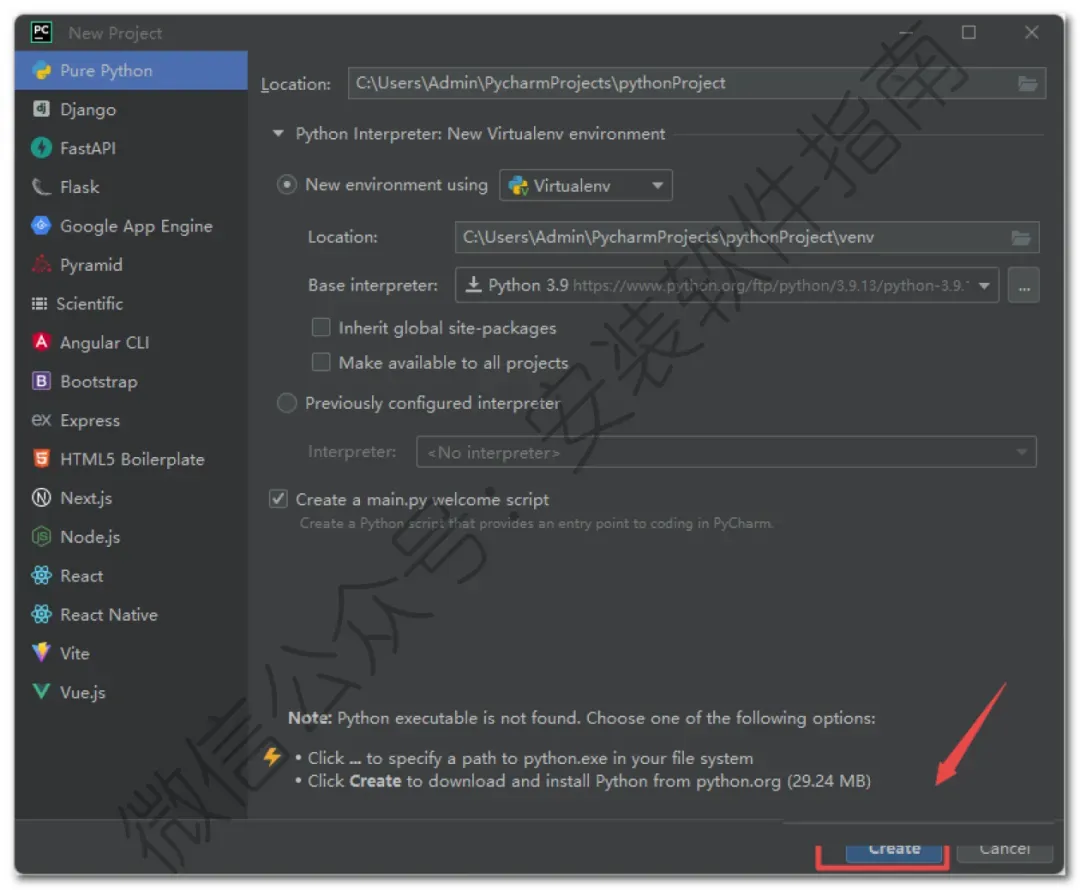 23、文件存放位置和环境,点击“Create“