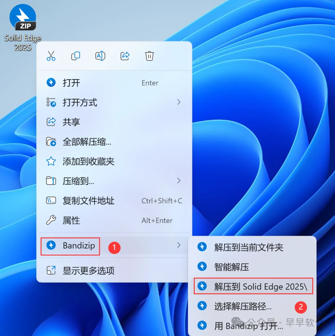 1、下载Solid Edge 2025软件安装包到电脑上,右键选择【解压到Solid Edge 2025\】